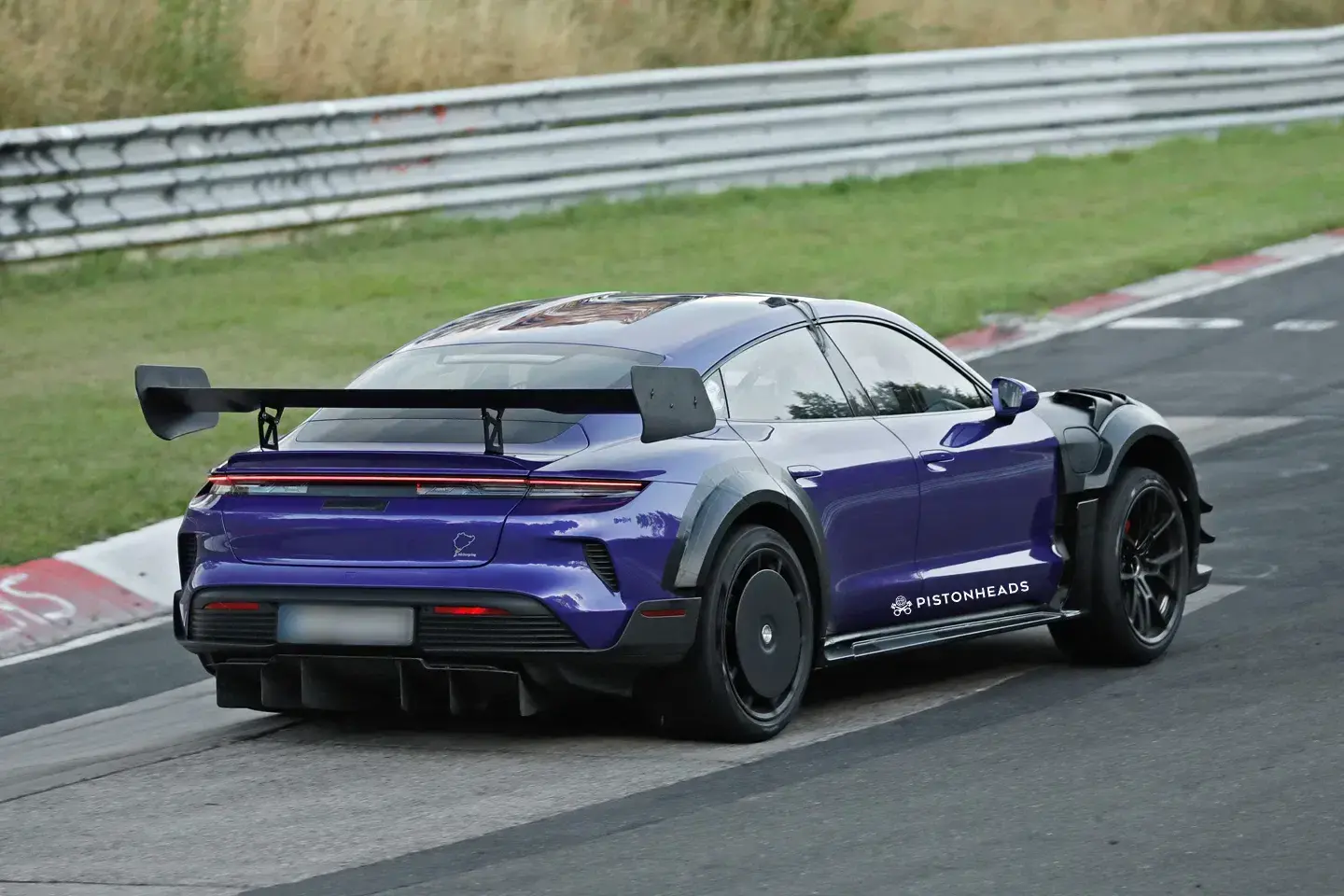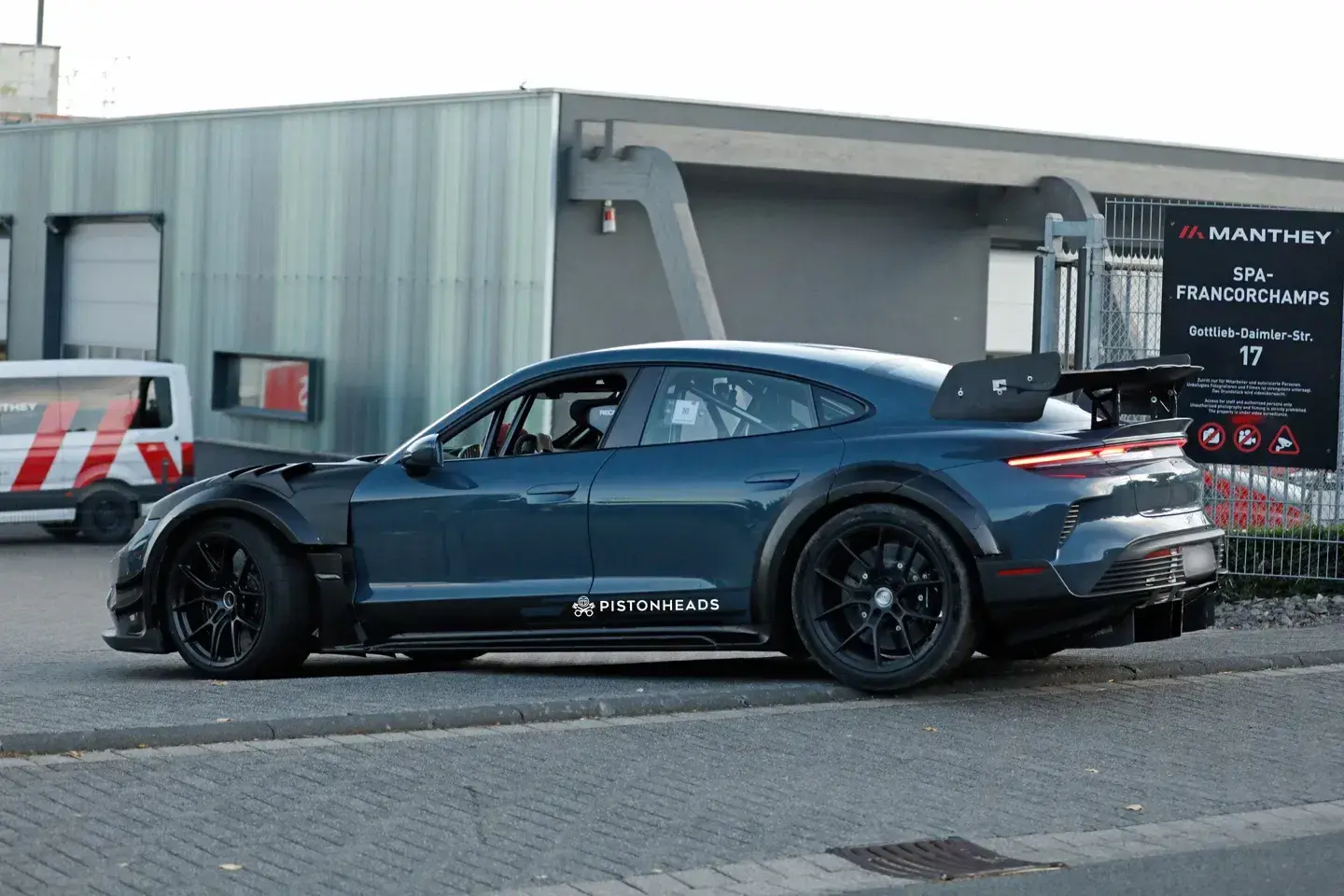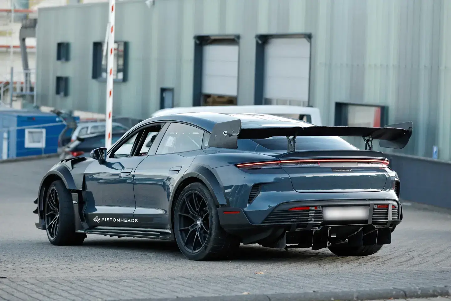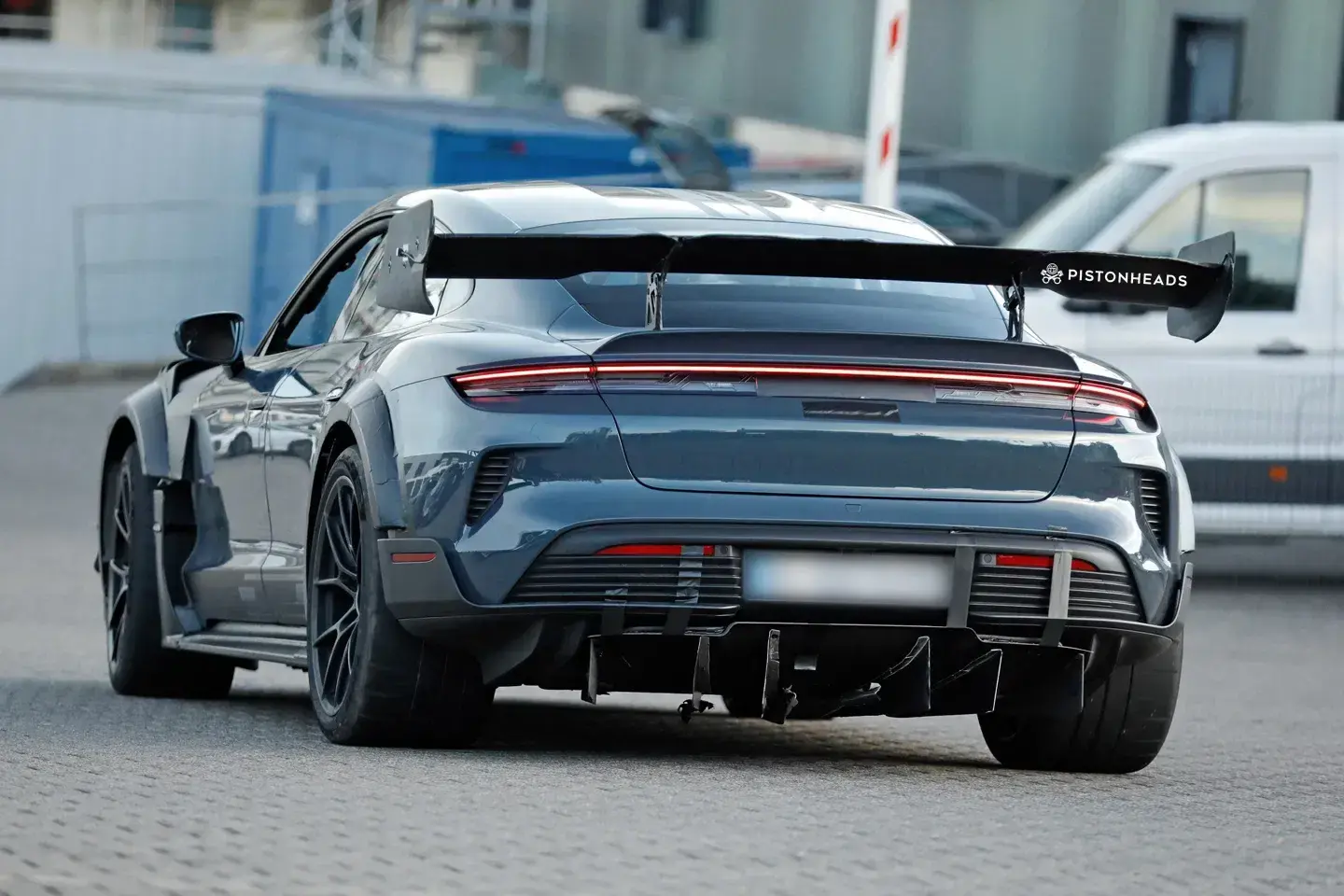 Multiple spy photos and on-track sightings show a heavily modified Taycan that insiders are referring to as the Taycan Turbo GT4 RS. The car presents radical aerodynamic hardware: a surfboard-style rear wing with large endplates, carbon-fibre front wings, aggressive canards, and a diffuser that looks more prototype than production.