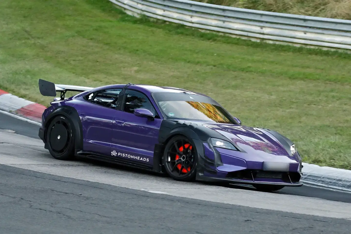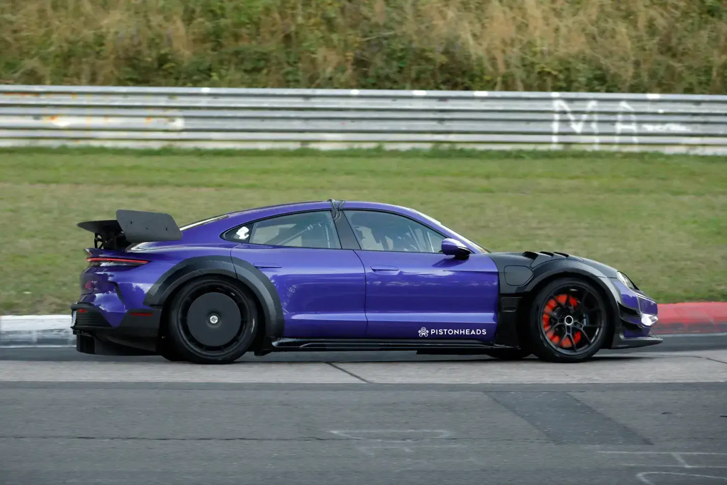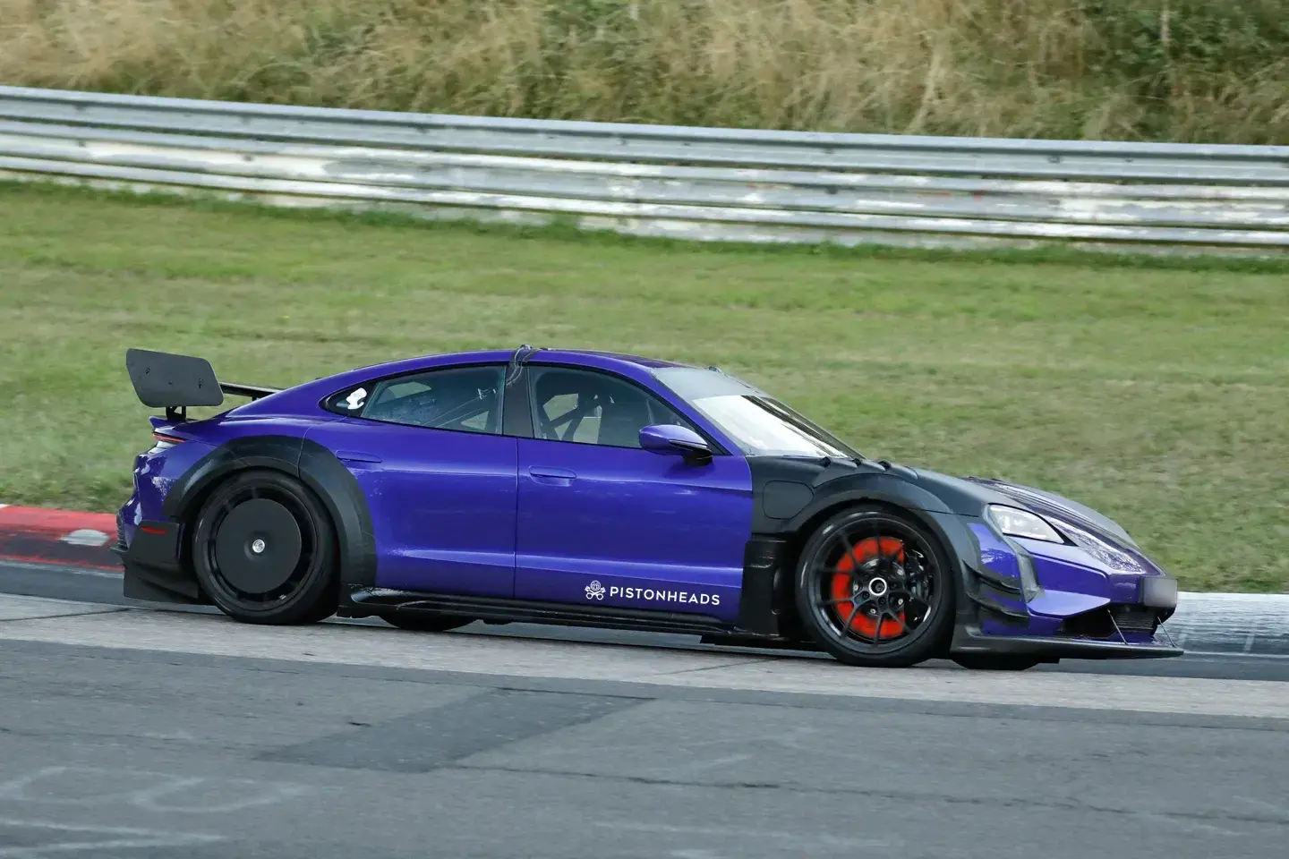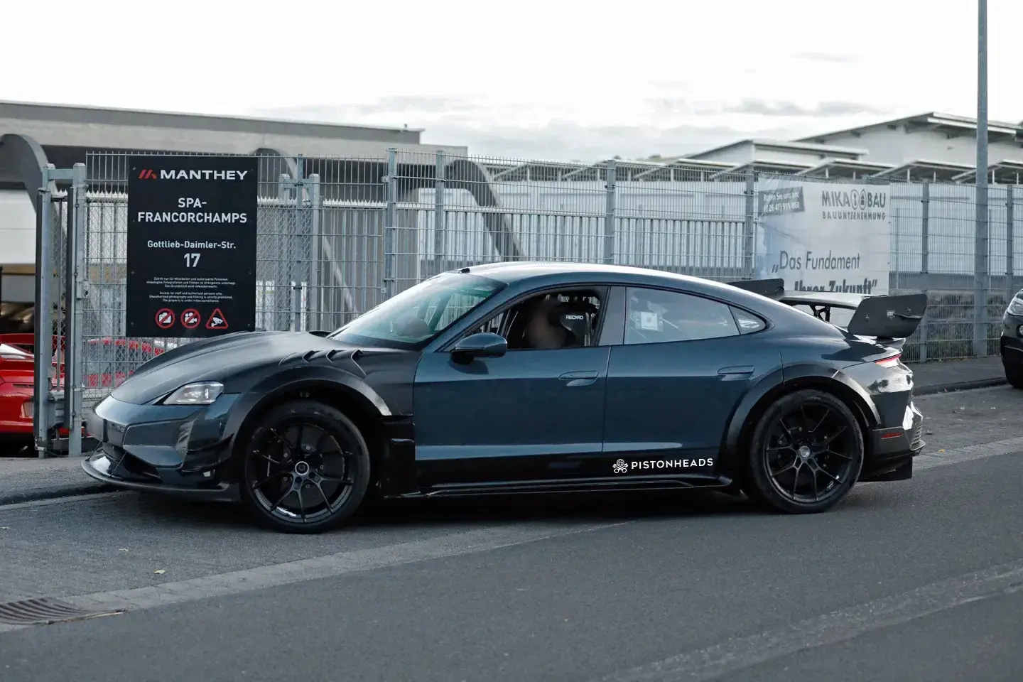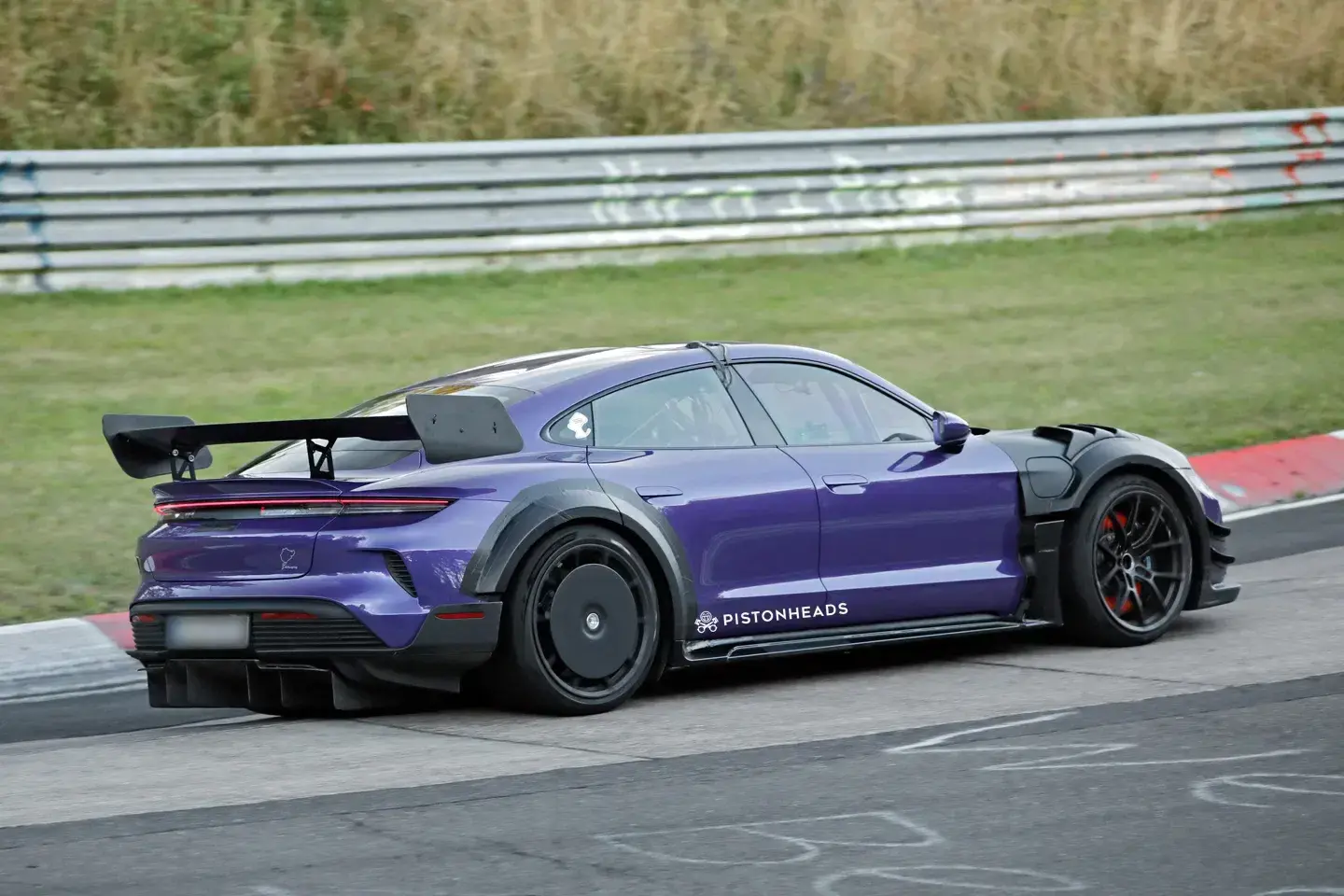 Multiple spy photos and on-track sightings show a heavily modified Taycan that insiders are referring to as the Taycan Turbo GT4 RS. The car presents radical aerodynamic hardware: a surfboard-style rear wing with large endplates, carbon-fibre front wings, aggressive canards, and a diffuser that looks more prototype than production.