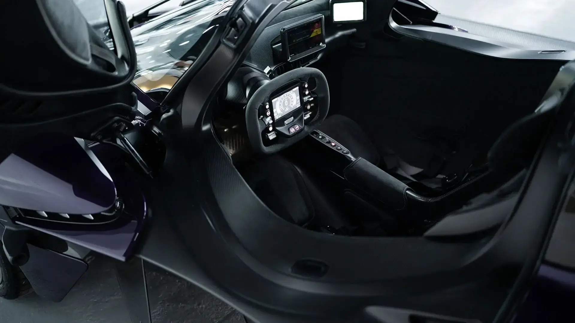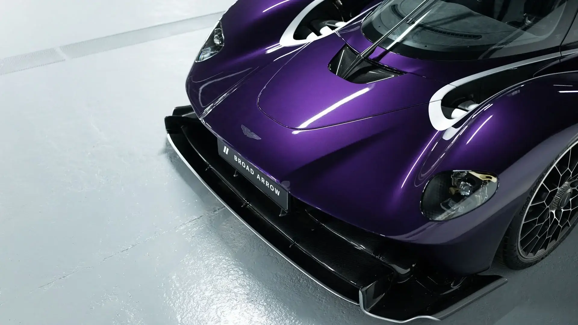 Chassis number 39 was ordered by Argentine collector Alejandro Roemmers as a left-hand-drive, Swiss-delivered Valkyrie Spider through Aston Martin's Q personalization unit. The car's exterior specification centers on a vivid Storm Purple Gloss finish—a £25,000 option—accented with Trophy Silver pinstriping across critical aerodynamic surfaces.