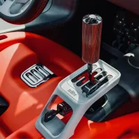 Access to the Nilu's cabin is via gullwing doors, revealing a driver-focused interior. Two low-mounted sports seats and an H-pattern shifter with an exposed mechanism emphasize the car's purist approach. Digital screens are absent, save for a digital rearview mirror. Traditional dials and billet-machined controls dominate, with the steering wheel free of any distracting controls.