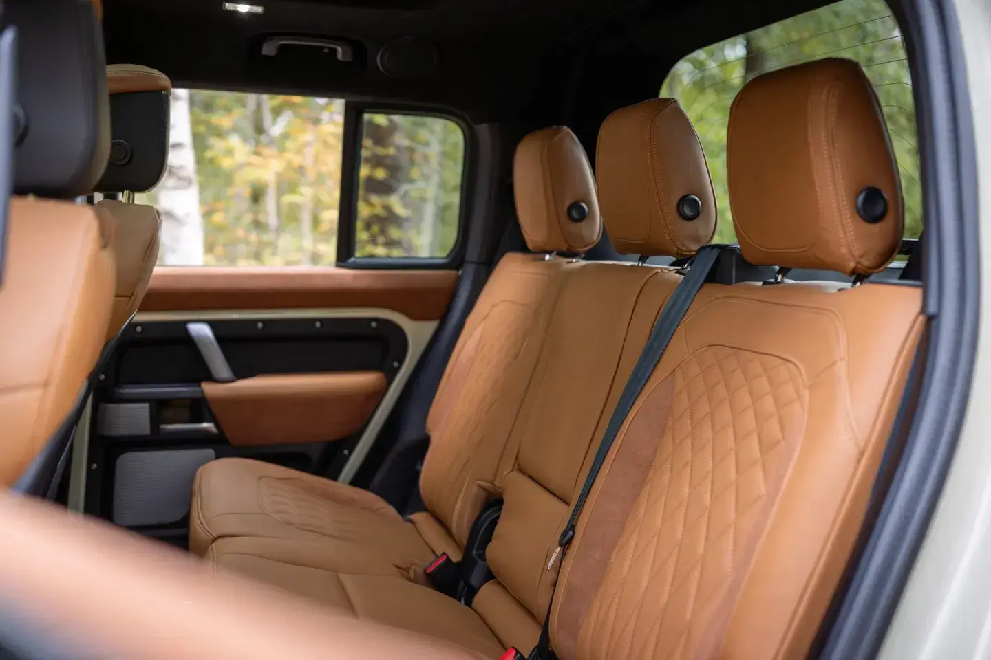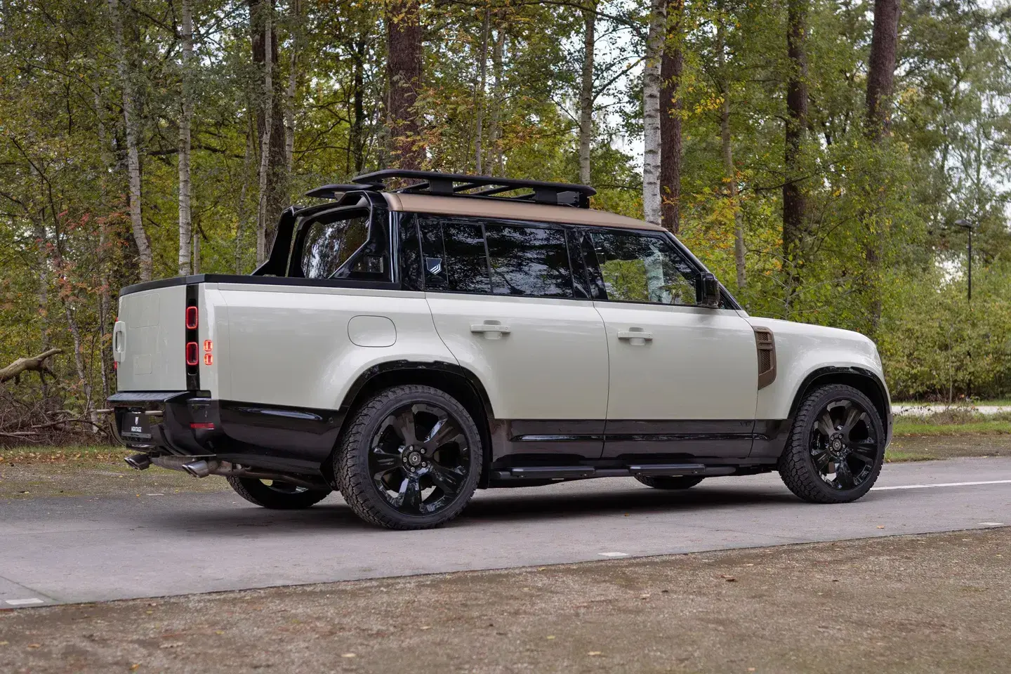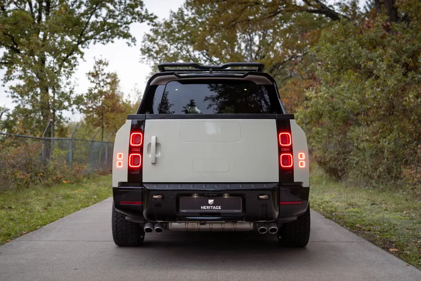 The Heritage Customs Defender Pickup is built from a V8-powered Defender 130 donor. The conversion preserves five-passenger seating and adds an integrated load bay with flowing rear bodywork that keeps the silhouette cohesive.