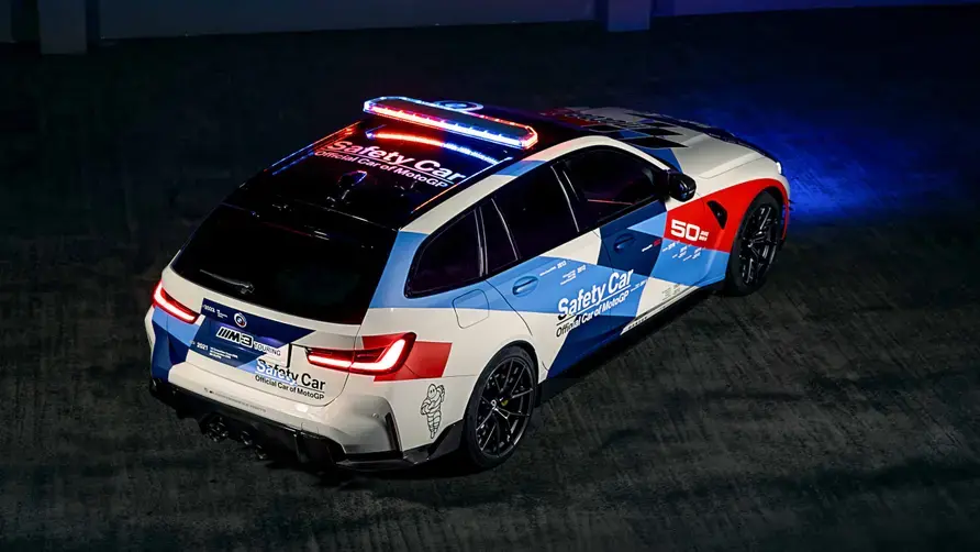 This M3 Touring is the new MotoGP safety vehicle, as you may have guessed from the stickers, lights, and unique "50 years of M" livery.