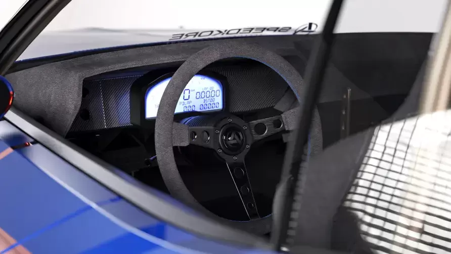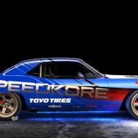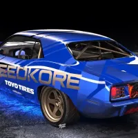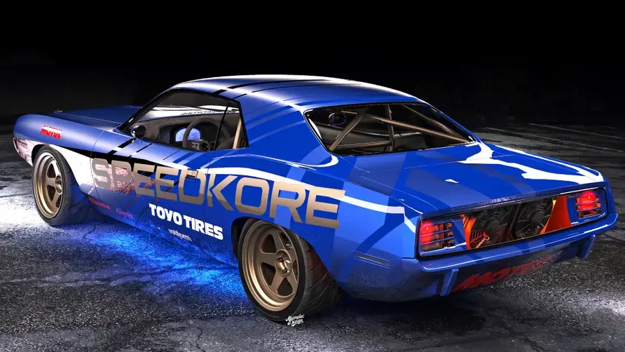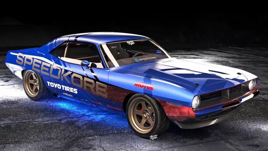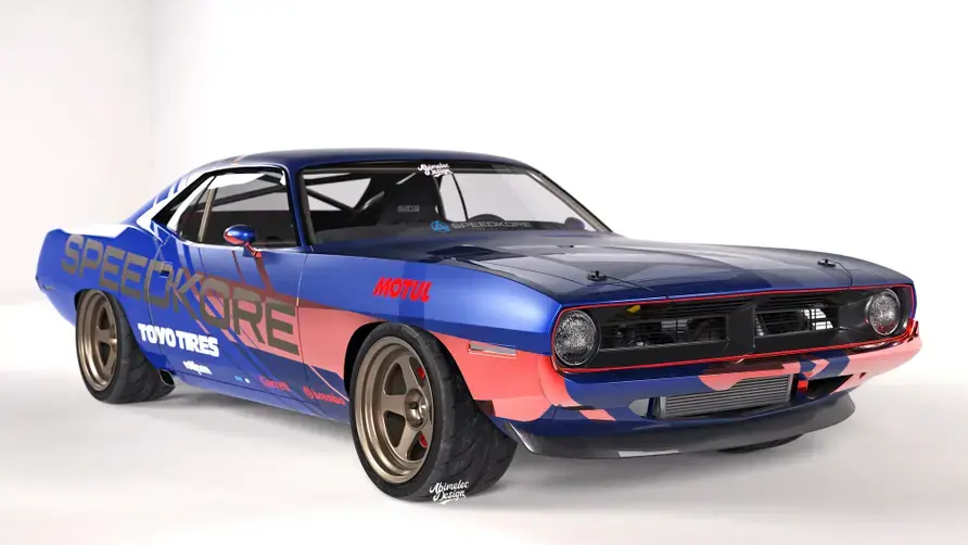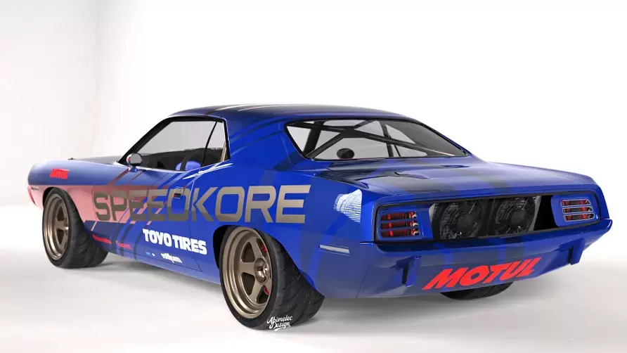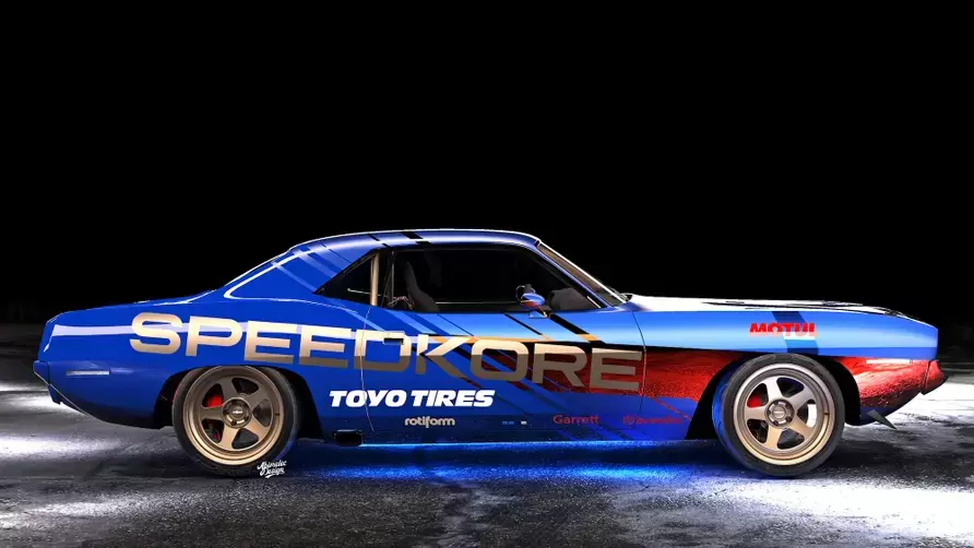 Now that what was formerly a high-performance 'Cuda has been given a turbocharged 4.0-liter straight six from Ford Australia, sometimes known as the Ford Barra engine, Speedkore has made its own sideways-happy pun.