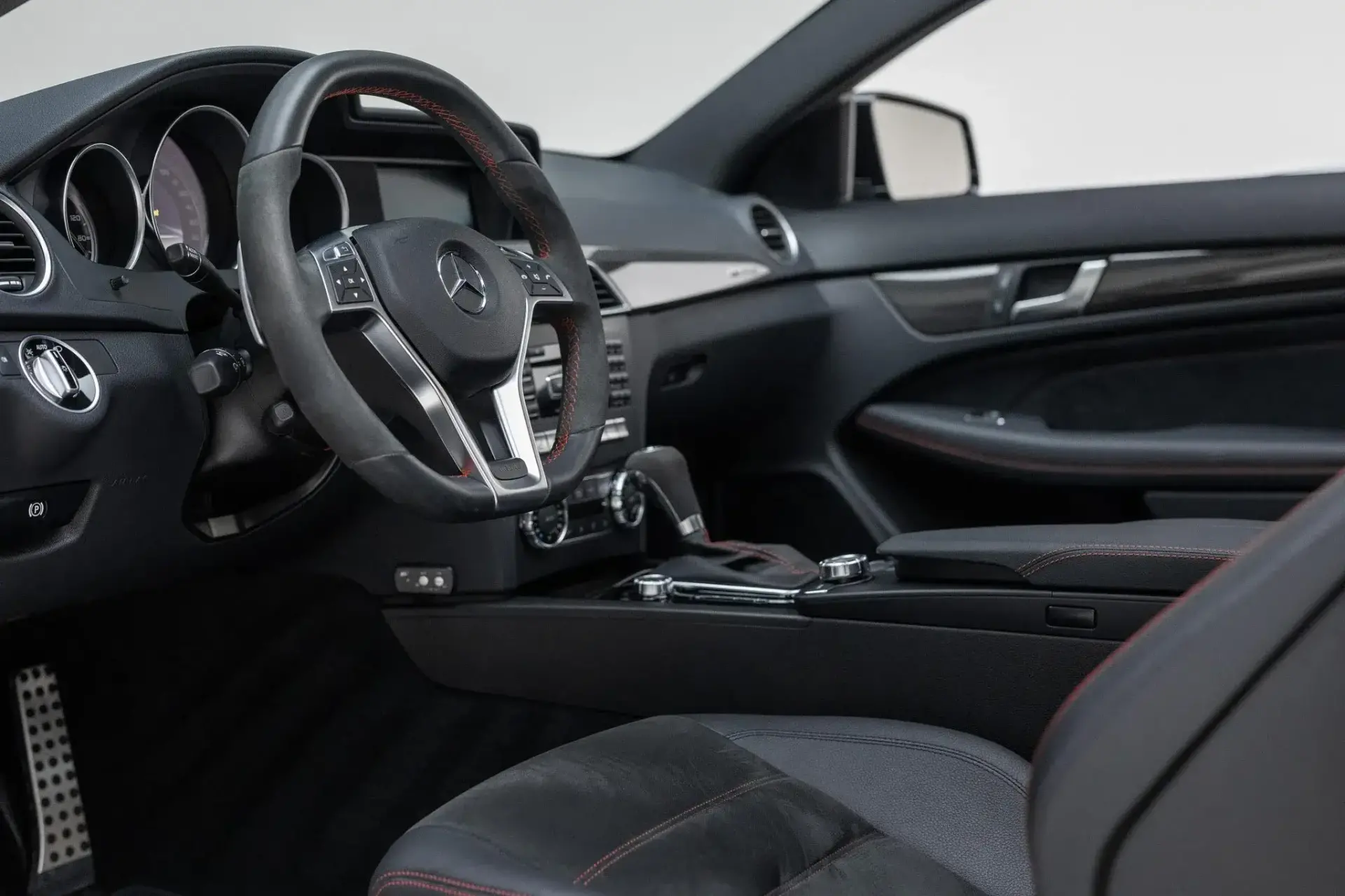 The cabin features heated power-adjustable sport seats trimmed in Black leather and Dinamica with contrasting red stitching, red seatbelts, and carbon-fiber trim.Standard equipment includes COMAND infotainment with navigation, Harman Kardon audio system, Keyless-Go, Bluetooth, and dual-zone automatic climate control.