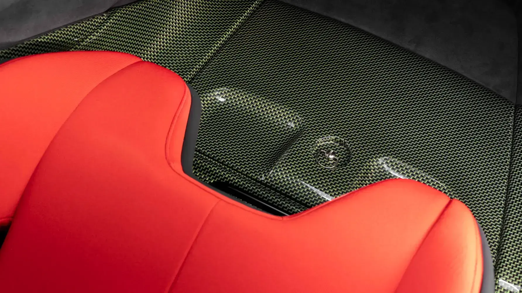 The cabin channels the F40's lightweight ethos with modern materials. Kevlar returns — specially developed for the SC40 — used in the footwells, behind the seats and on the floor mats. Alcantara and carbon fibre add refinement while keeping the interior focused and purposeful.